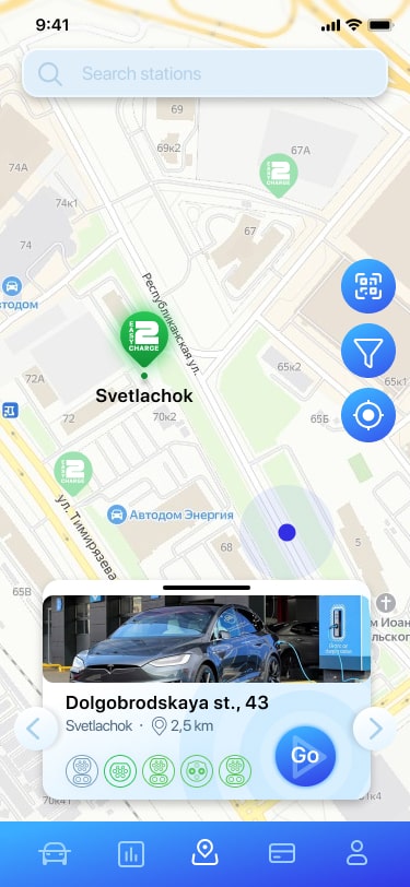 Connect to a station directly through the app, set charging limits by time or energy, and monitor the process.